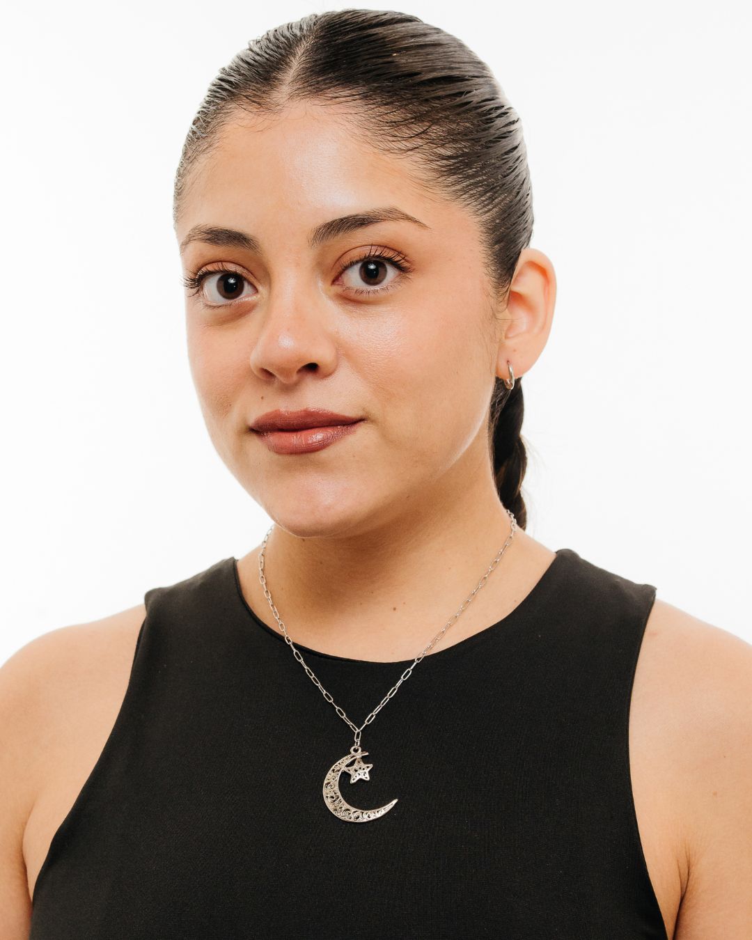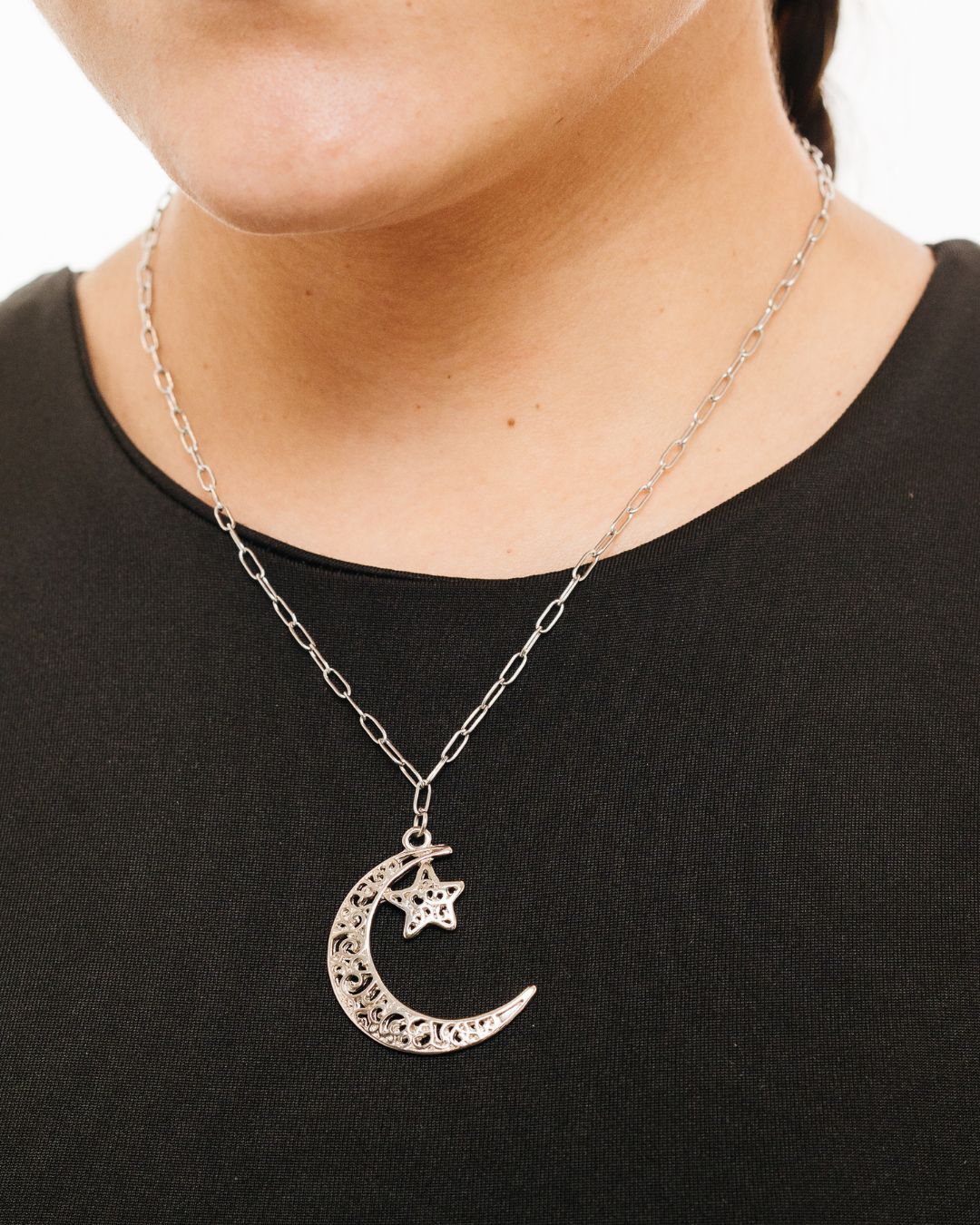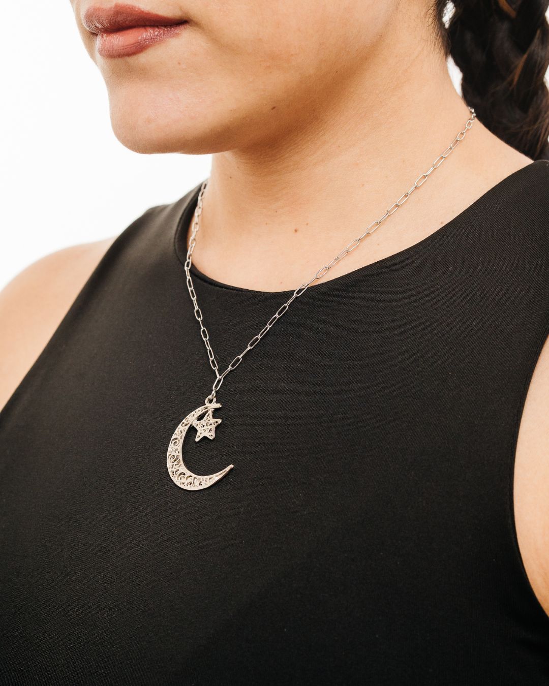 Accesorio, cadena de acero quirúrgico inoxidable hipoalergénico. Combina con dije Luna y estrella calado, niquelado. Fornituras de unión y cierre de acero quirúrgico. Ideal para looks delicados.
