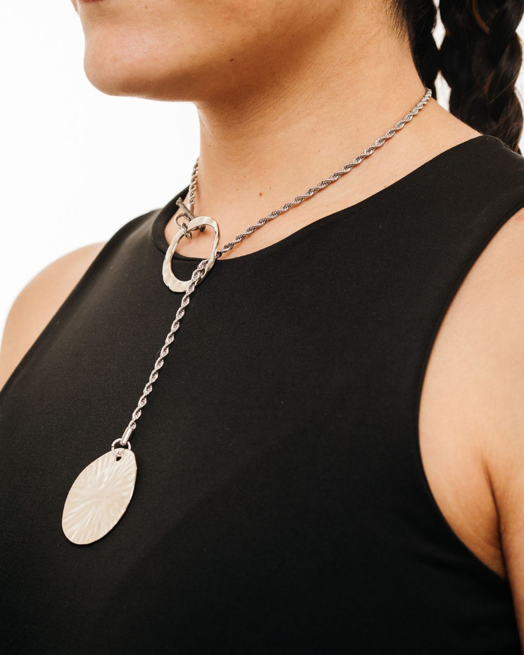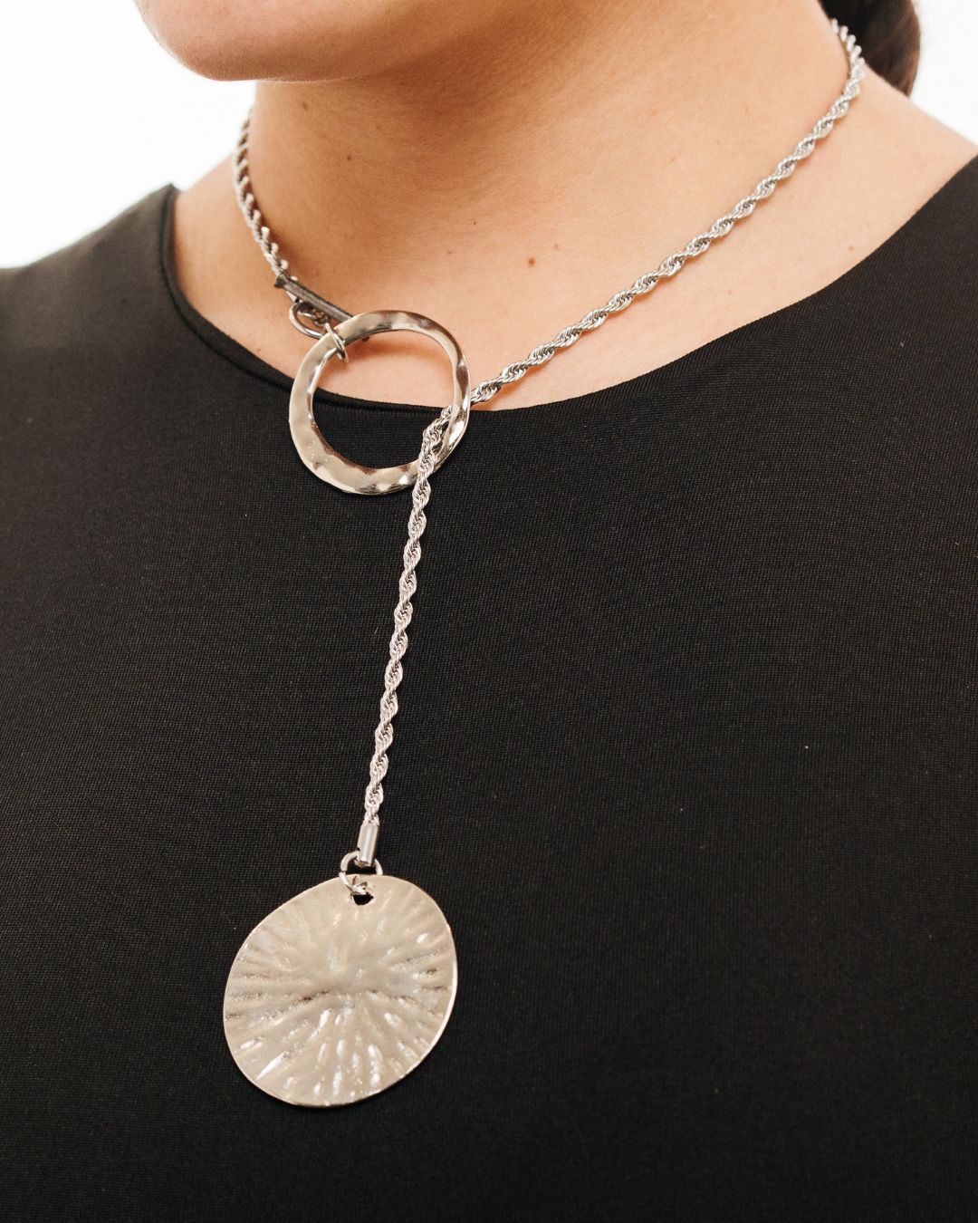 Accesorio, de acero quirúrgico inoxidable hipoalergénico. Combina con arandela y chapa martillada de fundición, zamak. Posee también cierre marinero de plata vieja. Ideal para looks que buscan transmitir fuerza sin perder delicadeza.