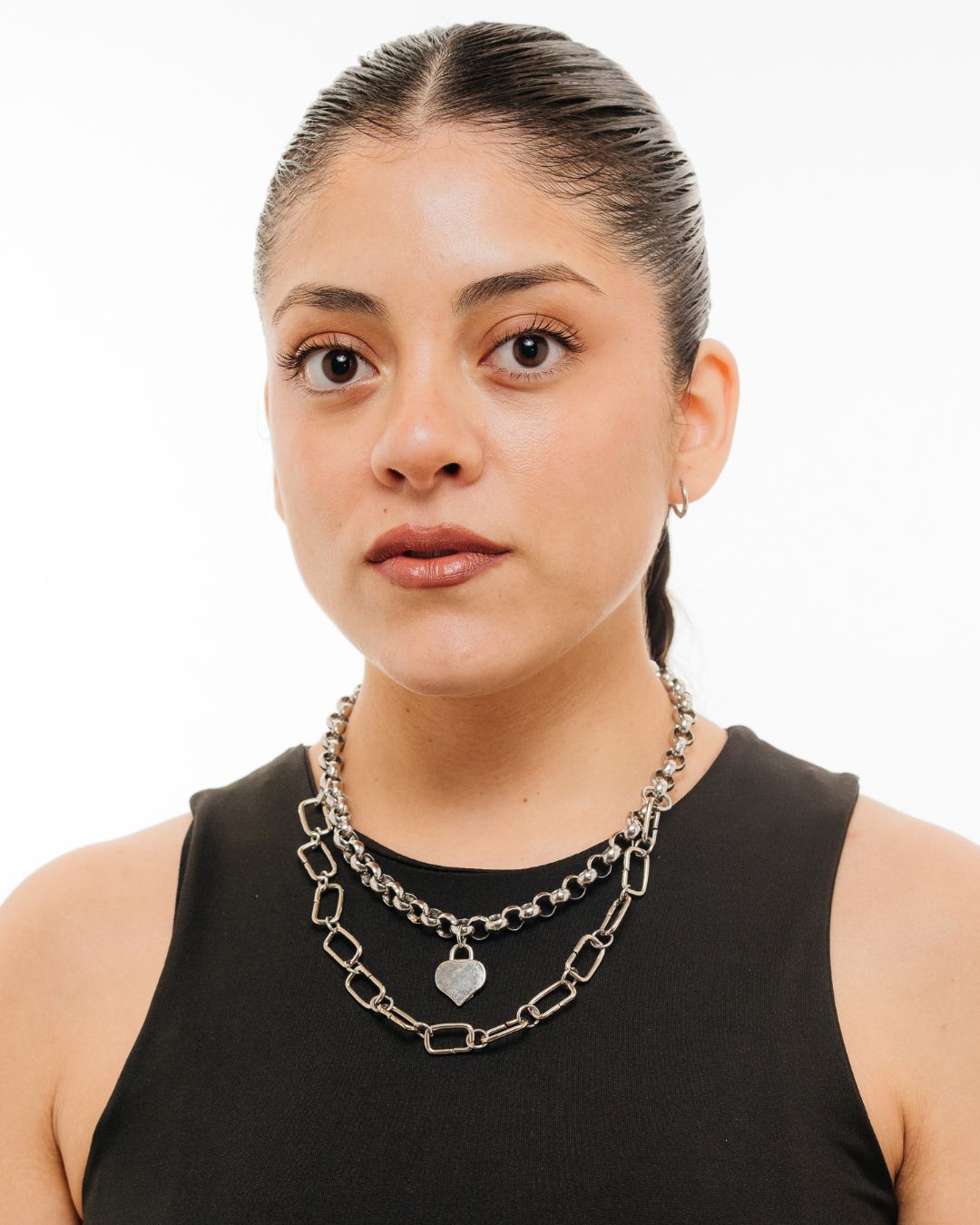 Cadena rolo de acero quirúrgico 316L hipoalergénico, excelente calidad. Con argollas rectangulares niqueladas, unidas con fornituras de acero quirúrgico. Dije corazón plano de níquel y cierre mosquetón. Ideal para looks nocturnos o de diario, para levantar outfits básicos. Importante, tener presente los cuidados en materiales niquelados.