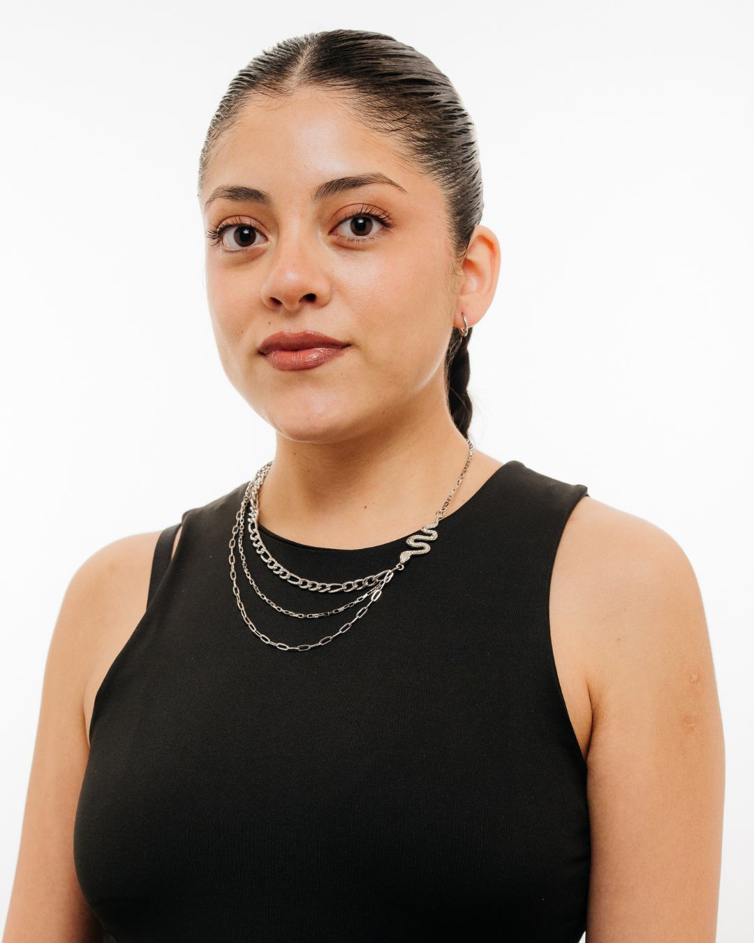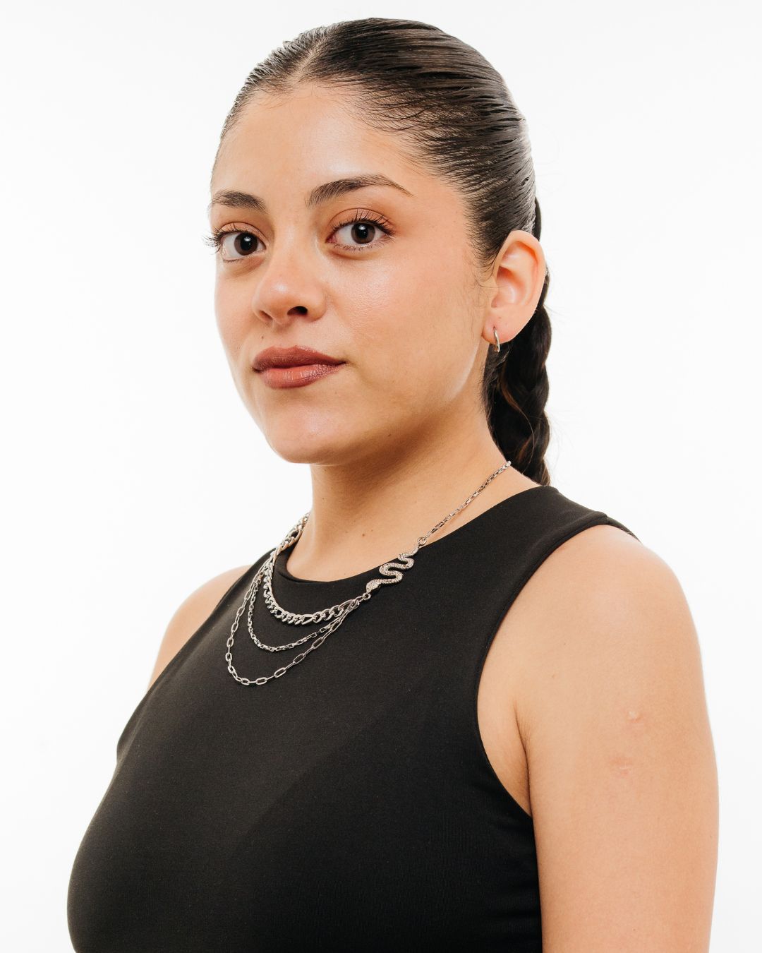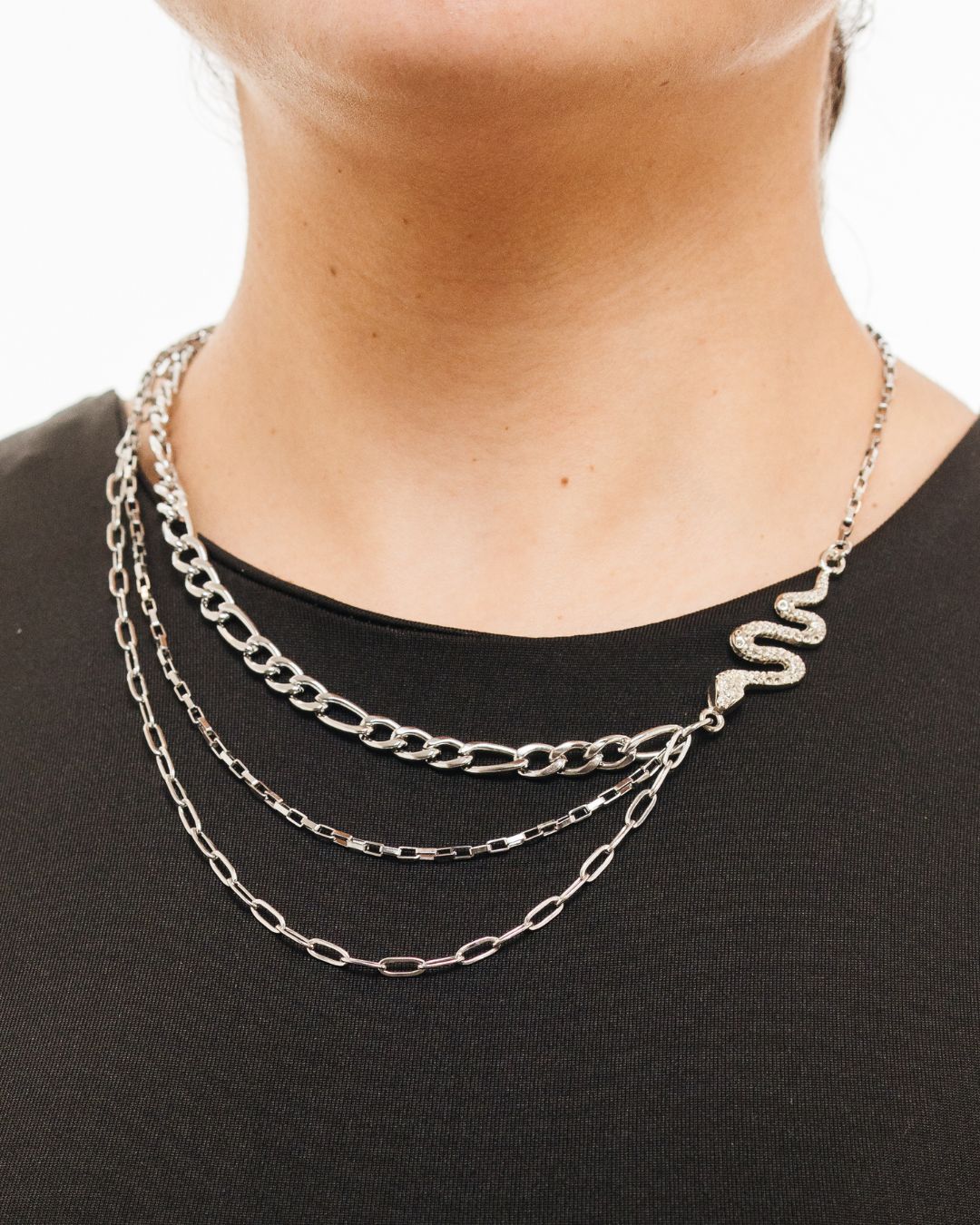 Cadenas de acero quirúrgico inoxidable hipoalergénico. Contiene dije de serpiente, niquelada. Fornituras de unión y cierre de acero quirúrgico. Ideal para looks jugados, que busquen destacar.