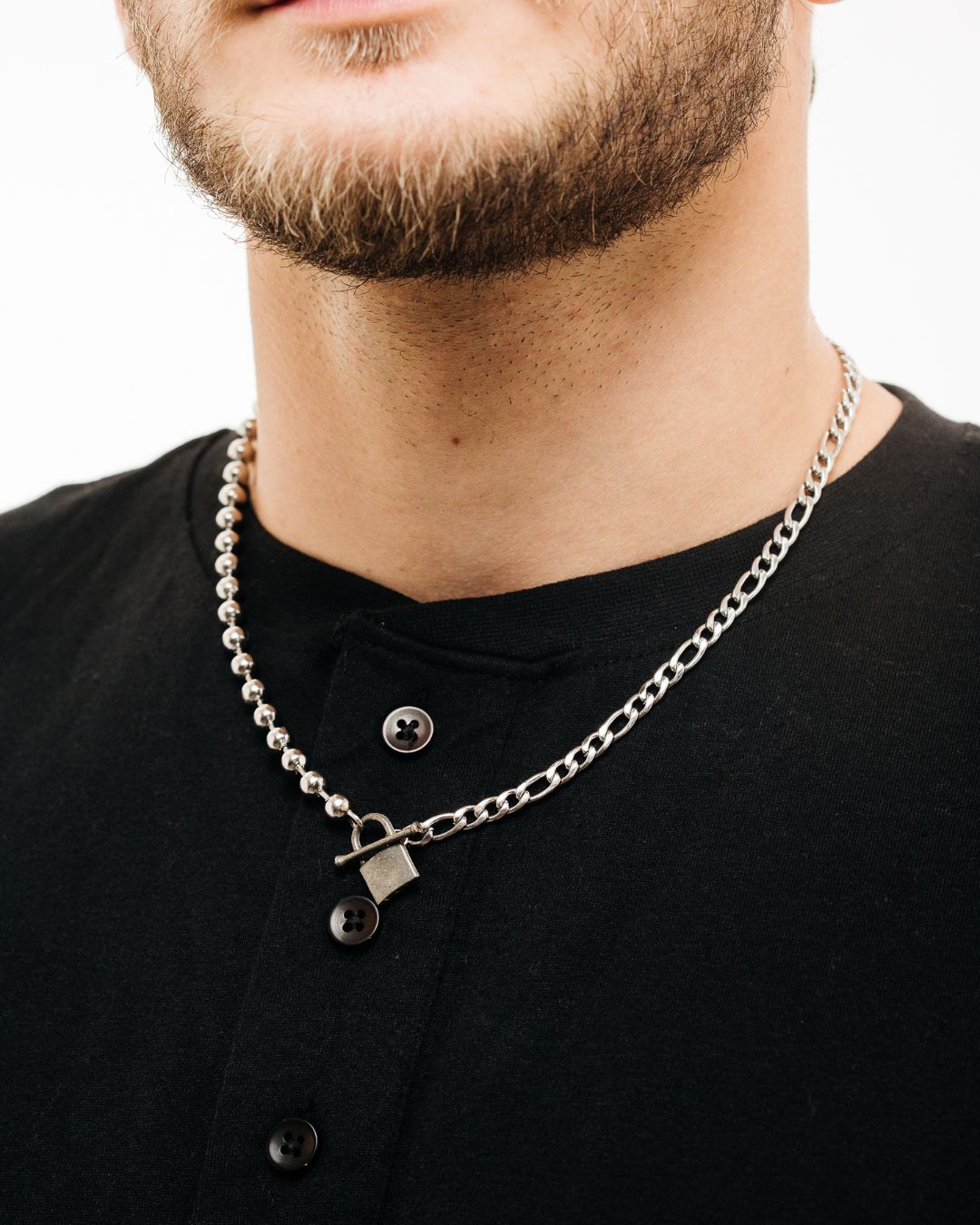 Dos tipos de cadenas en un solo accesorio. Cadenas de acero quirúrgico inoxidable, 316L hipoalergénico, excelente calidad. Con dije candado cierre marinero, material plata vieja. Fornituras de unión y cierre de acero quirúrgico. Ideal para looks urbanos, nocturnos o de diario.