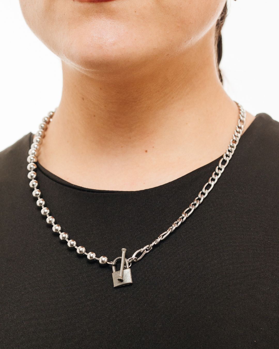 Unión de cadenas, estilo urbano en acero quirúrgico con dije candado y cierre marinero en plata vieja. Un diseño disruptivo y versátil que aporta actitud y fuerza a cualquier look.